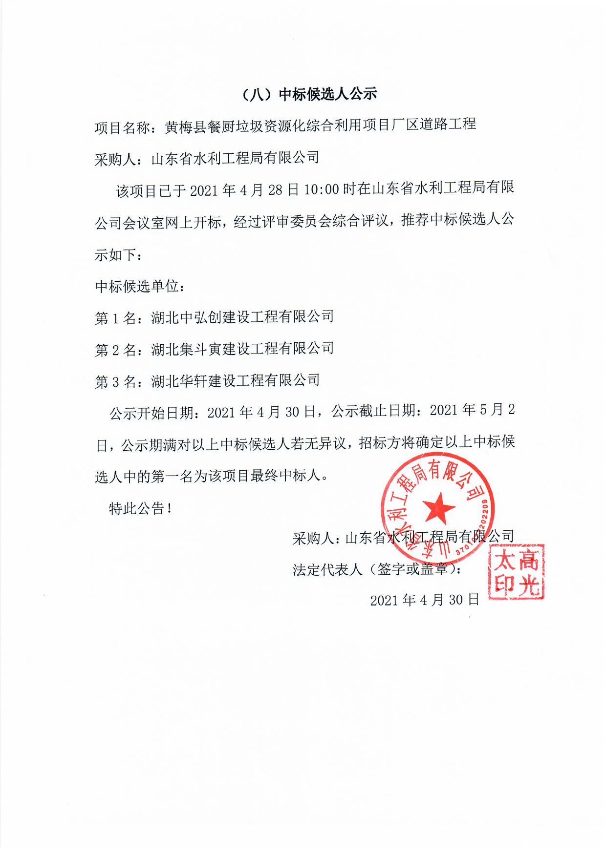 黃梅縣餐廚垃圾資源化綜合利用項(xiàng)目廠區(qū)道路工程中標(biāo)候選人公示