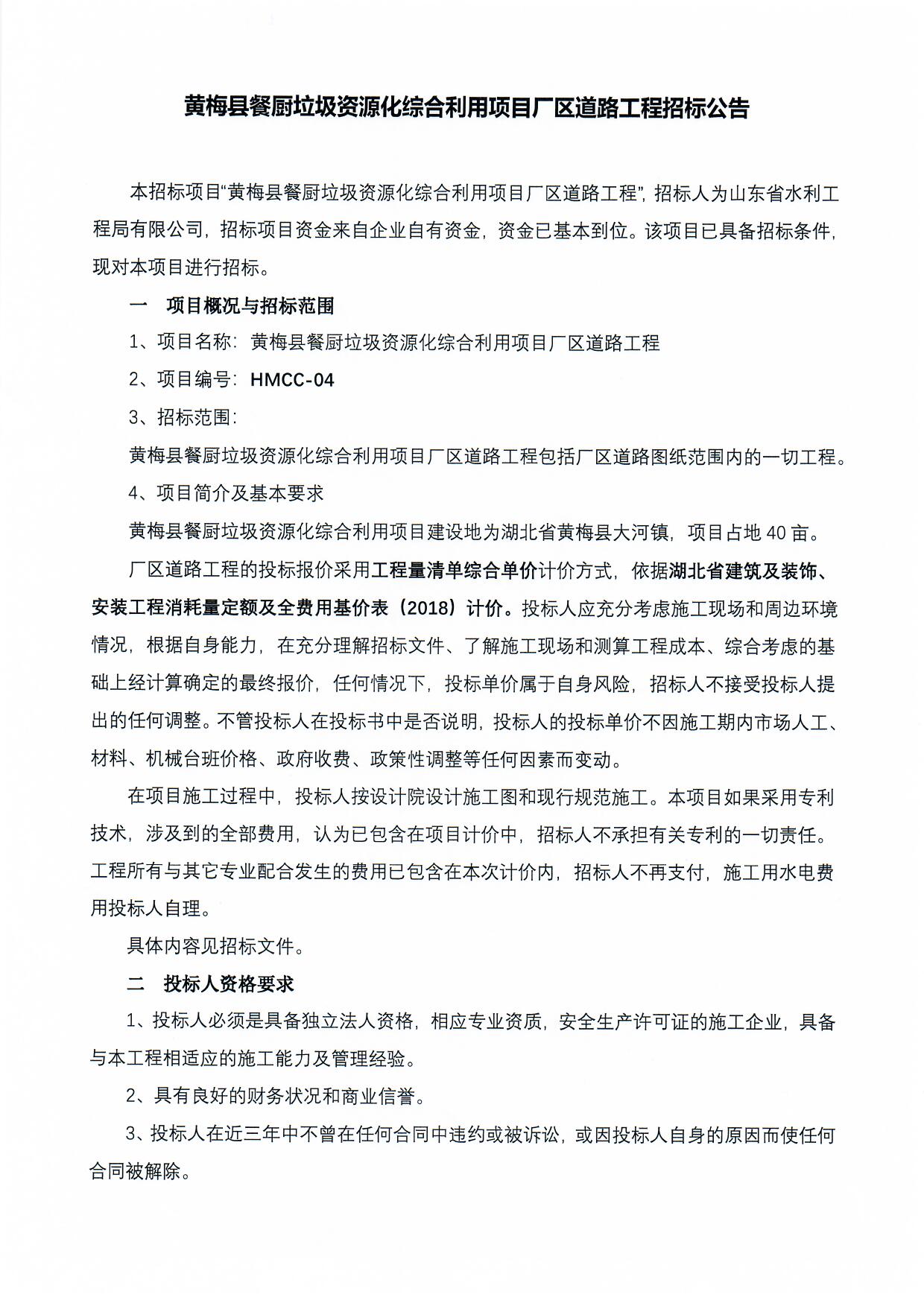 黃梅縣餐廚垃圾資源化綜合利用項目廠區(qū)道路工程招標公告