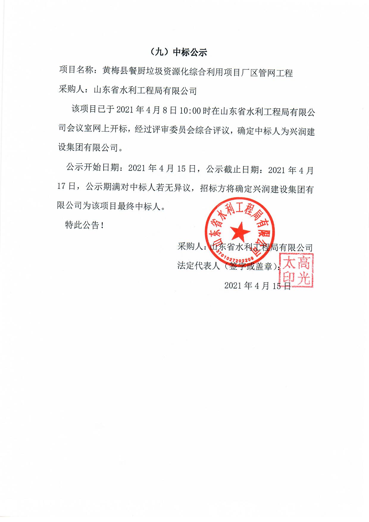 山東省水利工程局有限公司餐廚垃圾處理廠智能信息化管控平臺(tái)中標(biāo)公示