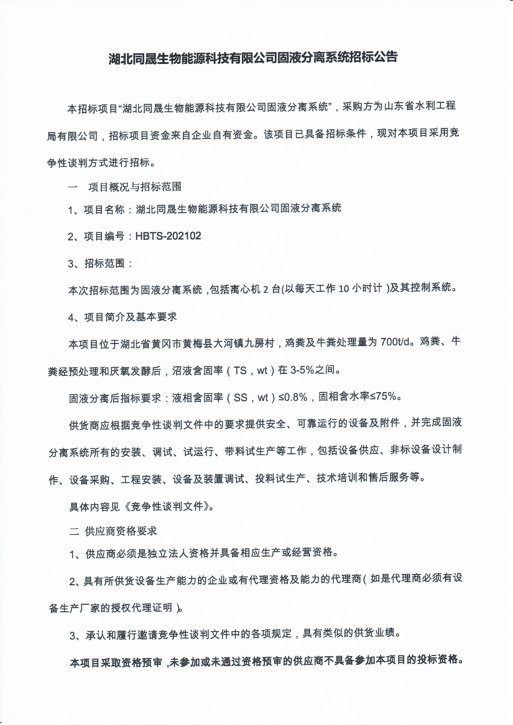 湖北同晟生物能源科技有限公司固液分離系統(tǒng)招標(biāo)公告
