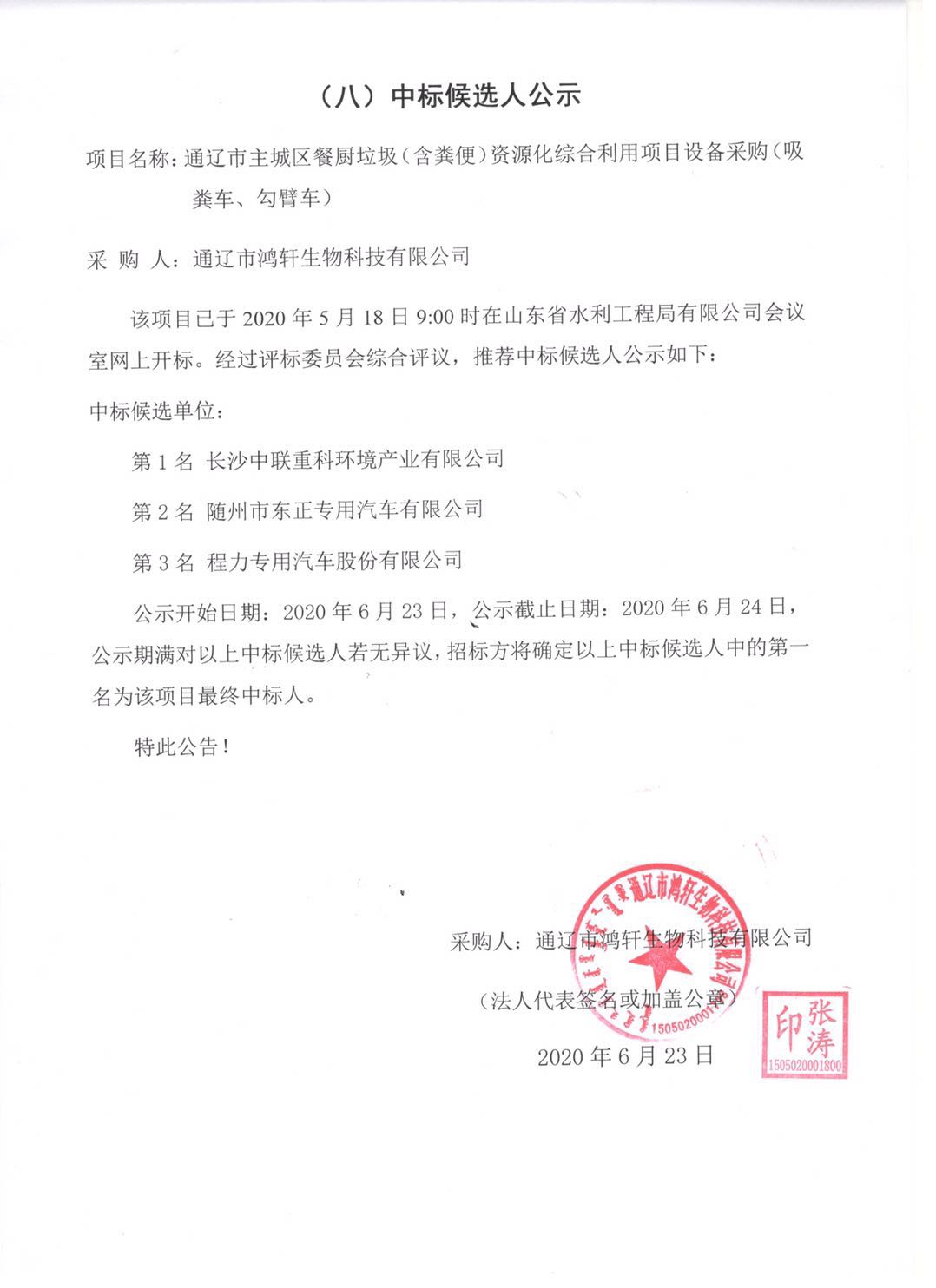 通遼主城區(qū)餐廚垃圾(含糞便)資源化綜合利用項目設(shè)備采購中標(biāo)候選人公示