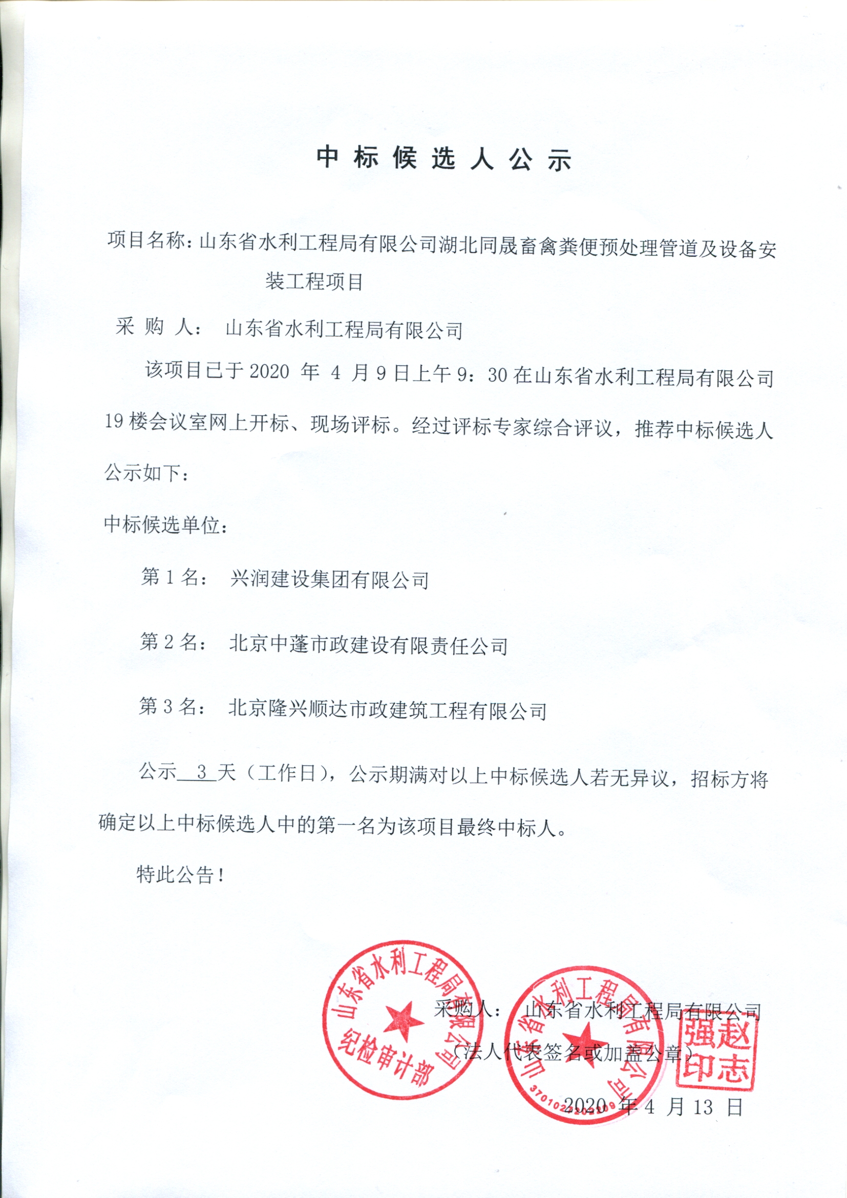 湖北同晟畜禽糞便預(yù)處理管道及設(shè)備安裝工程項目中標(biāo)候選人公示
