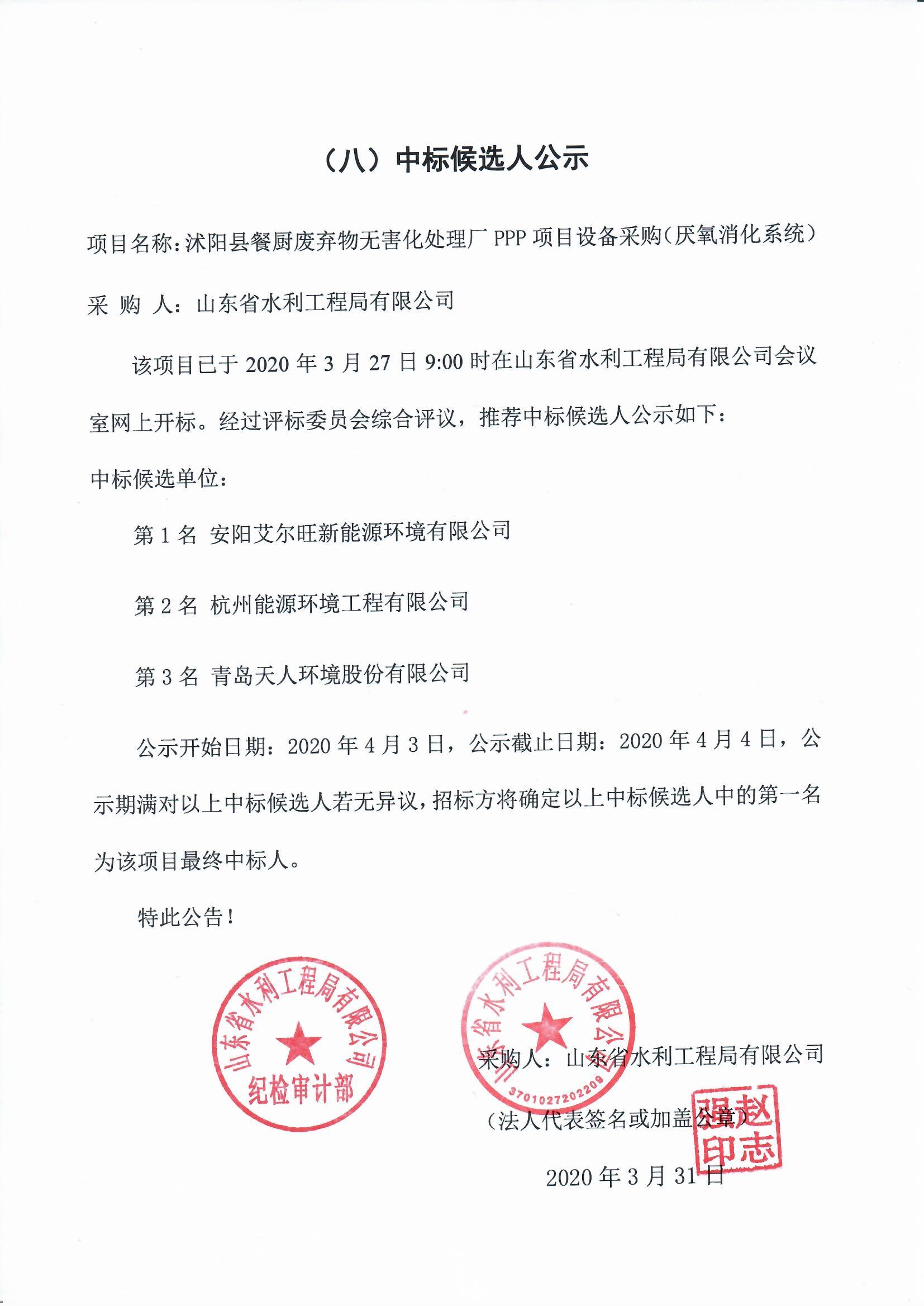 沭陽縣餐廚廢棄物無害化處理廠PPP項目設(shè)備采購(厭氧消化系統(tǒng))中標(biāo)候選人公示