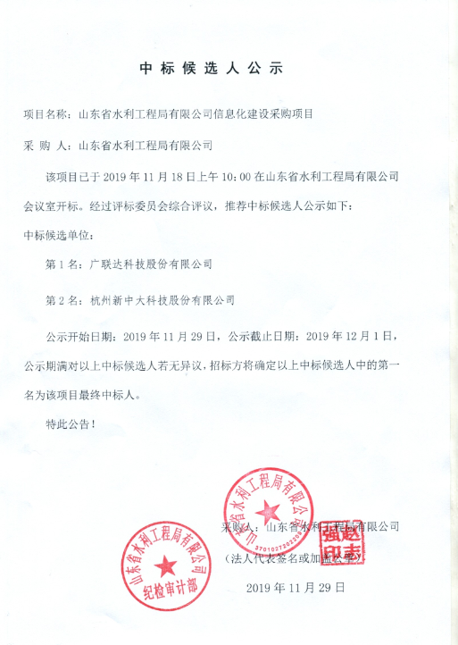 山東省水利工程局有限公司信息化系統(tǒng)采購(gòu)項(xiàng)目中標(biāo)候選人公示
