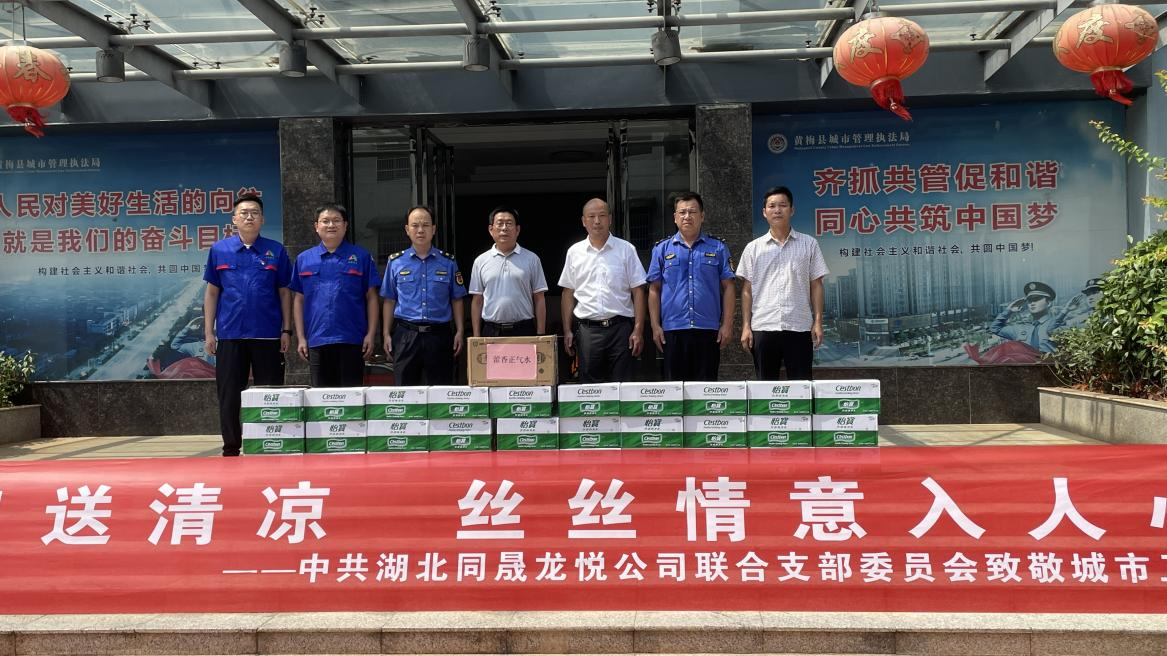 7月28日,為了表達(dá)對在酷暑中堅守一線城管執(zhí)法人員的敬意,湖北同晟龍悅公司聯(lián)合黨支部在董事長張峰同志的帶領(lǐng)下,為奮戰(zhàn)在一線的“城市衛(wèi)士”開展送清涼活動。